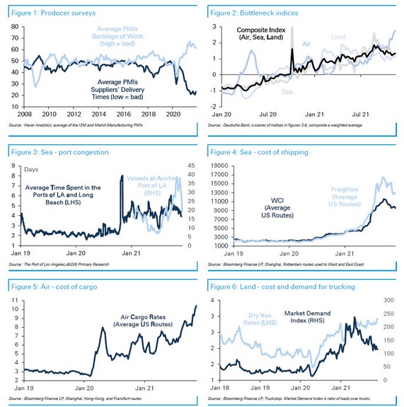 To explain, Deutsche Bank presented several charts that highlight 2021’s inflationary problems. However, whether it’s suppliers’ delivery times, backlogs of work, port congestion, bottleneck indices, or the cost of shipping and trucking, several inflationary indicators (excluding air cargo rates) have already peaked and rolled over.