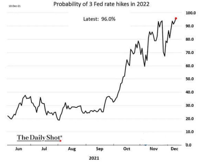 Speaking of three hikes, the market-implied probability of three FOMC rate hikes in 2022 has risen to 96%.