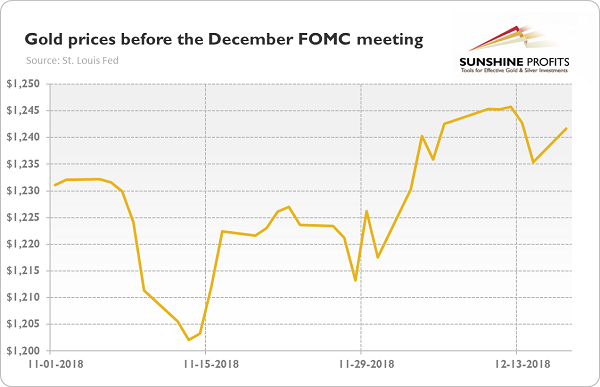 The market awaits the monetary policy decision of the FOMC and its fresh economic projections. If the Committee surprises on the dovish (hawkish) side, gold will shine (struggle). Our bet is that – given the attitude of the new Board Governors, the stock market correction, and reduced forecast for global growth in the coming years – the December economic projections might be less optimistic than in September. It would be also in line with the previous December meetings when hawkish actions were accompanied by dovish signals.