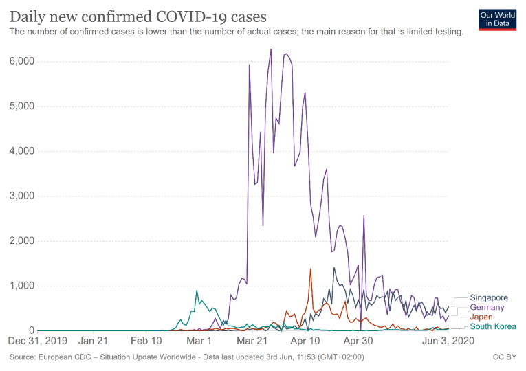 Chart 2: Daily confirmed Covid-19 cases in Germany (purple line), Japan (blue line), Singapore (grey line) and South Korea (red line)