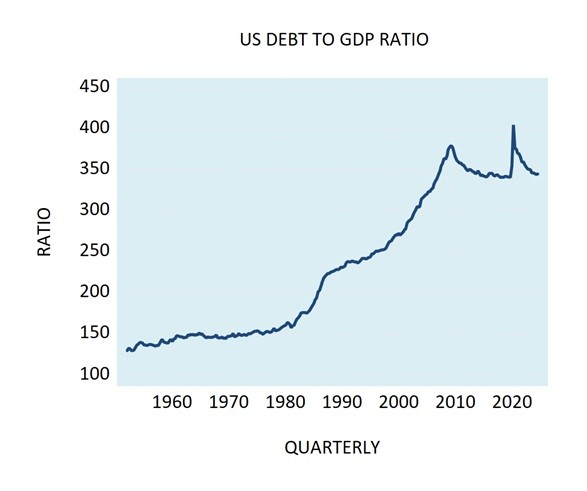 Many economic commentators are of the view that the high level of debt poses a threat to the US economy. The debt-to-GDP ratio stood at 345.7 in Q3 2024 against 130.4 in Q1 1952 (see chart).