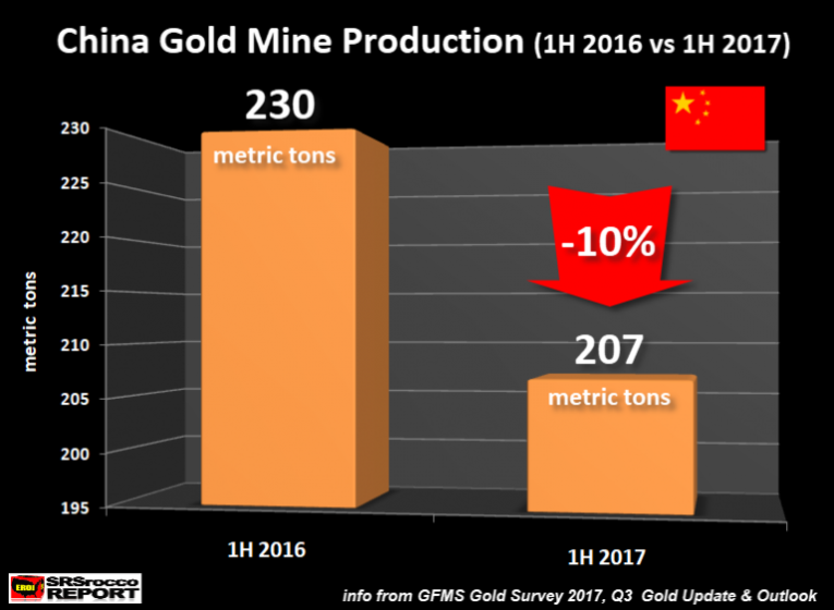Gold production in the world’s largest gold producer and buyer fell by nearly 10% in the first half of 2017 in what may be another indication of peak gold.