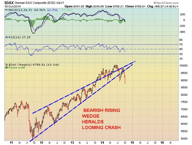 Based upon the irrefutable bearish trend reversals of all the above charts, it is reasonable to forecast that stocks worldwide will most probably suffer a material correction here to yearend…and most probably well into 2015. In fact it is predicted the extent of the stock correction may indeed replicate the severity of the 2007-2008 bear market…when stocks were hammered down more than 50%. Only the intervention of the US Fed and the Euro Union Central Bank can avert a major Stock Market Crash by flooding the markets with liquidity via QE (aka printing new money). In this event, the value of all currencies will plummet as most smart investors will trade their paper fiat money for GOLD AND SILVER.