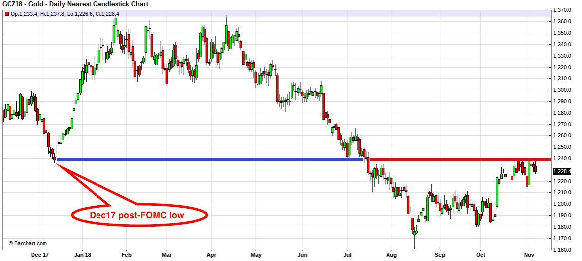 And there is precedent for such a year-end rally. As you can see below, each of the past three years have seen lows in mid-December, coming at around the time of the December FOMC. This year, the last FOMC meeting for 2018 is scheduled for December 18th and 19th. Could we see a similar rally in the final weeks of 2018? Why not? Most tax-loss selling will be completed, and just as in the previous three years, global investors will be once again looking ahead to the new year and seeing multiple possible catalysts for COMEX gold.