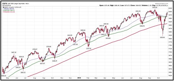Although the Federal Reserve has now ended its quantitative easing (QE) program, the stock market has taken this in its stride and all eyes are now on the Fed Funds Rate, which will not be increased anytime soon. Make no mistake, the Federal Reserve has repeatedly stated that it will pursue an accommodative monetary policy for the foreseeable future and this suggests that the ongoing party on Wall Street will continue for as far as the eye can see. For sure, the primary uptrend will be punctuated by periodic pullbacks to the key moving averages, but the bull market will probably continue for at least another 2-3 years.