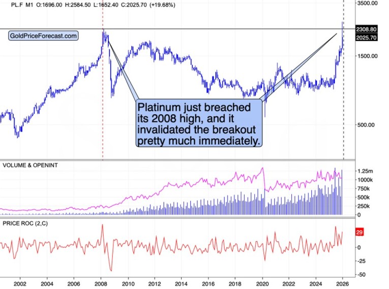 The “little silver” (that’s what “platina” means, while “plata” is silver) had recently spiked above $2,500 only to fall below $2,000 just a few hours ago. The move above $2,500 and above the 2008 was clearly invalidated.