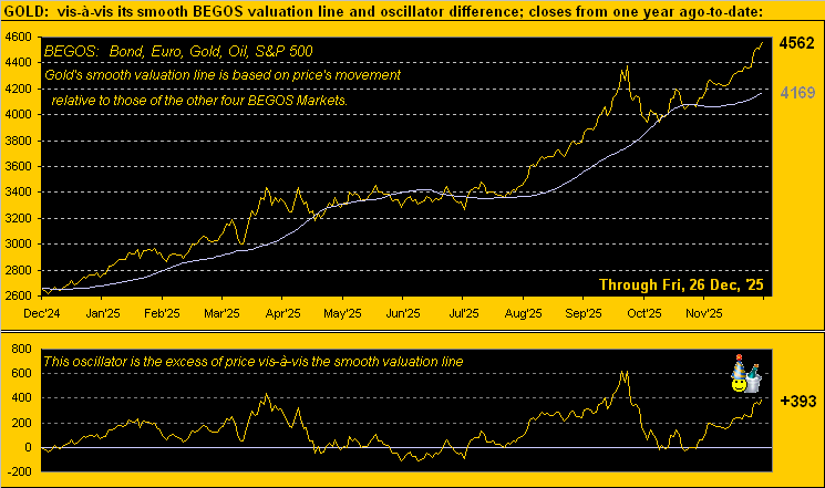 - “Now”, having settled yesterday (Friday) at a record-high close of 4562, ’tis a +337% increase over the past 10 years, 2025 finding everyone having suddenly become a Gold expert, in turn morphing the precious metals into “meme” stocks as we’ve on occasion quipped since this past spring (seasonally and pricewise).