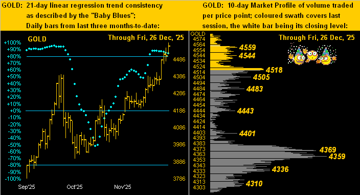 Now for our two-panel display of Gold, featuring its daily bars on the left from three months ago-to-date, and on the right the 10-day Market Profile. Mind the baby blues dots of regression trend consistency, for upon their falling below the +80% axis likely brings still lower prices. By the Profile, the nearest volume-dominant support level is 4518 as labeled: