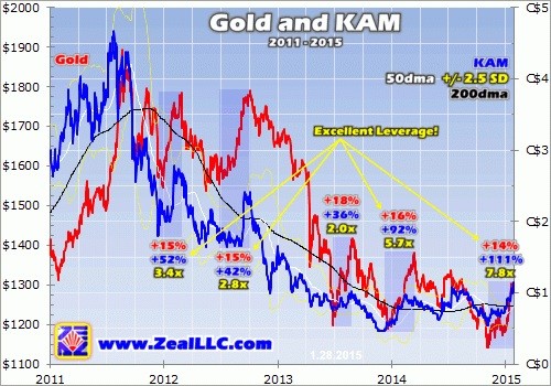 Thankfully KAM more than made up for 2013’s anomaly with stellar performance in the latest two uplegs rounding the corners of 2014 and 2015. In upleg #4 it soared an impressive 92% to gold’s 16% (5.7x leverage). And in ongoing upleg #5 it’s so far rocketed an even more impressive 111% to gold’s 14% (7.8x leverage).