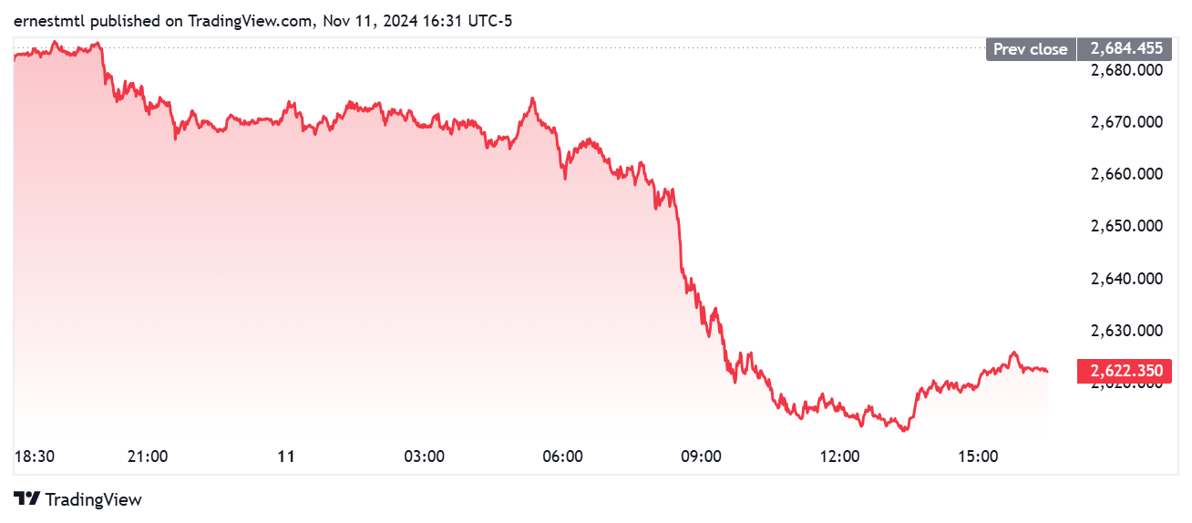 At the time of writing, spot gold trades at $2,622.35 for a decline of 2.31% on the session, while spot silver was down fallen 1.76% and trades at $30.716 per ounce after hitting a low of $30.407 around 11 a.m. EST