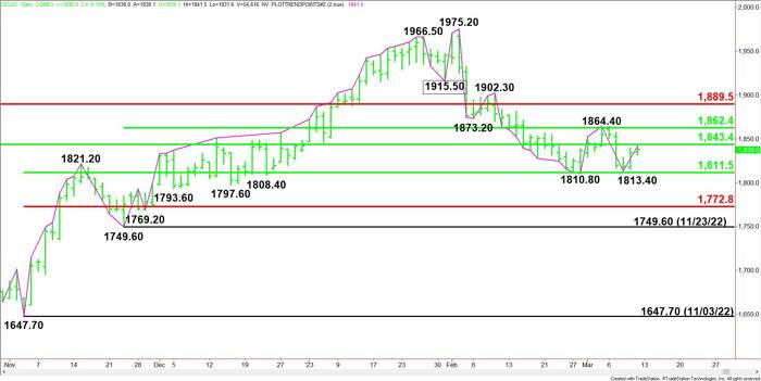 Trader reaction to the 50% level at $1843.40 is likely to determine the direction of the April Comex gold futures contract on Friday.