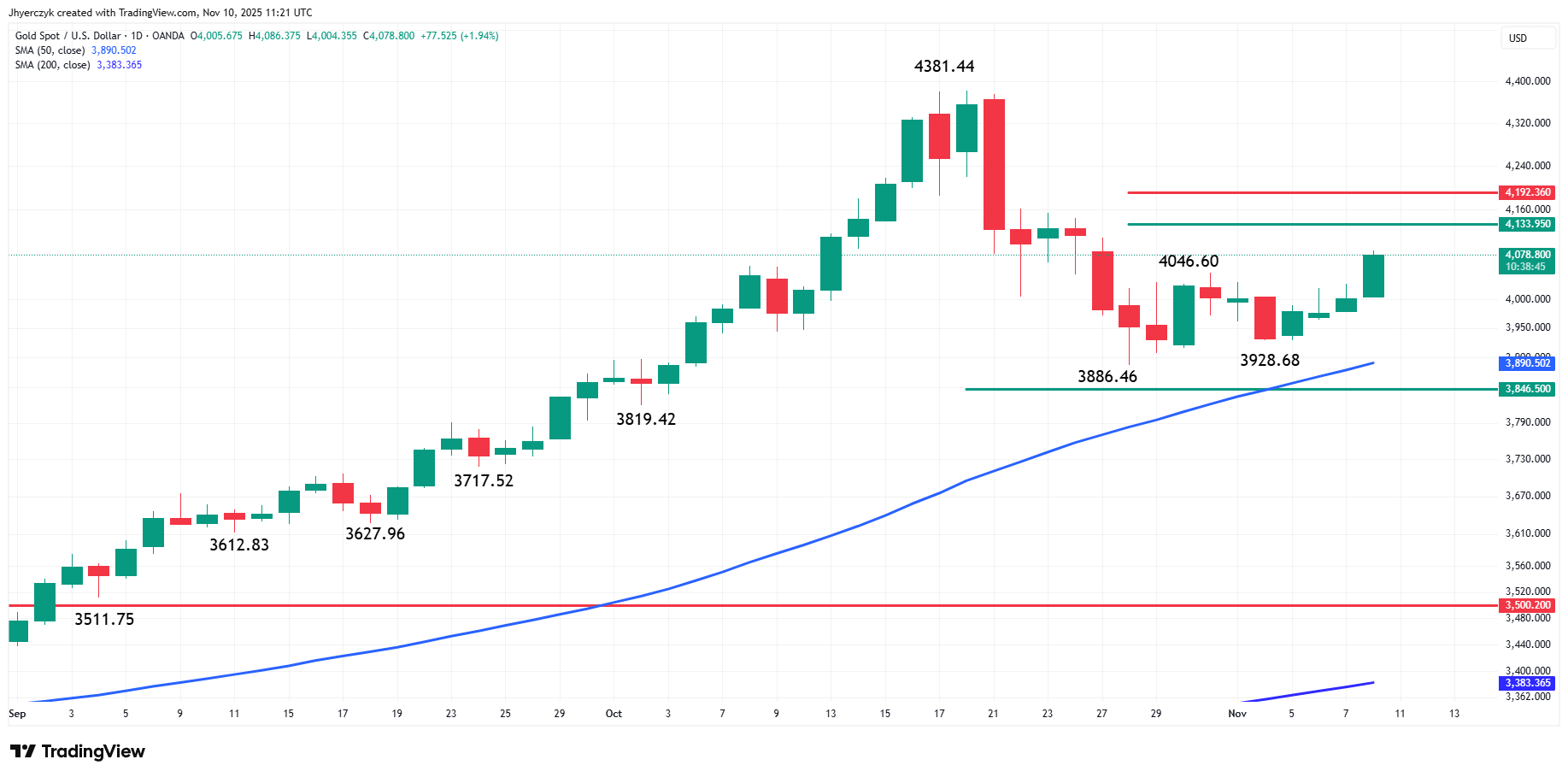 LONDON (November 10) Gold pushed higher on Monday, rising for a third straight session after clearing the October 31 swing top at $4046.60. The rally comes as weak U.S. economic data and progress toward ending the government shutdown fueled expectations for a Federal Reserve rate cut next month.