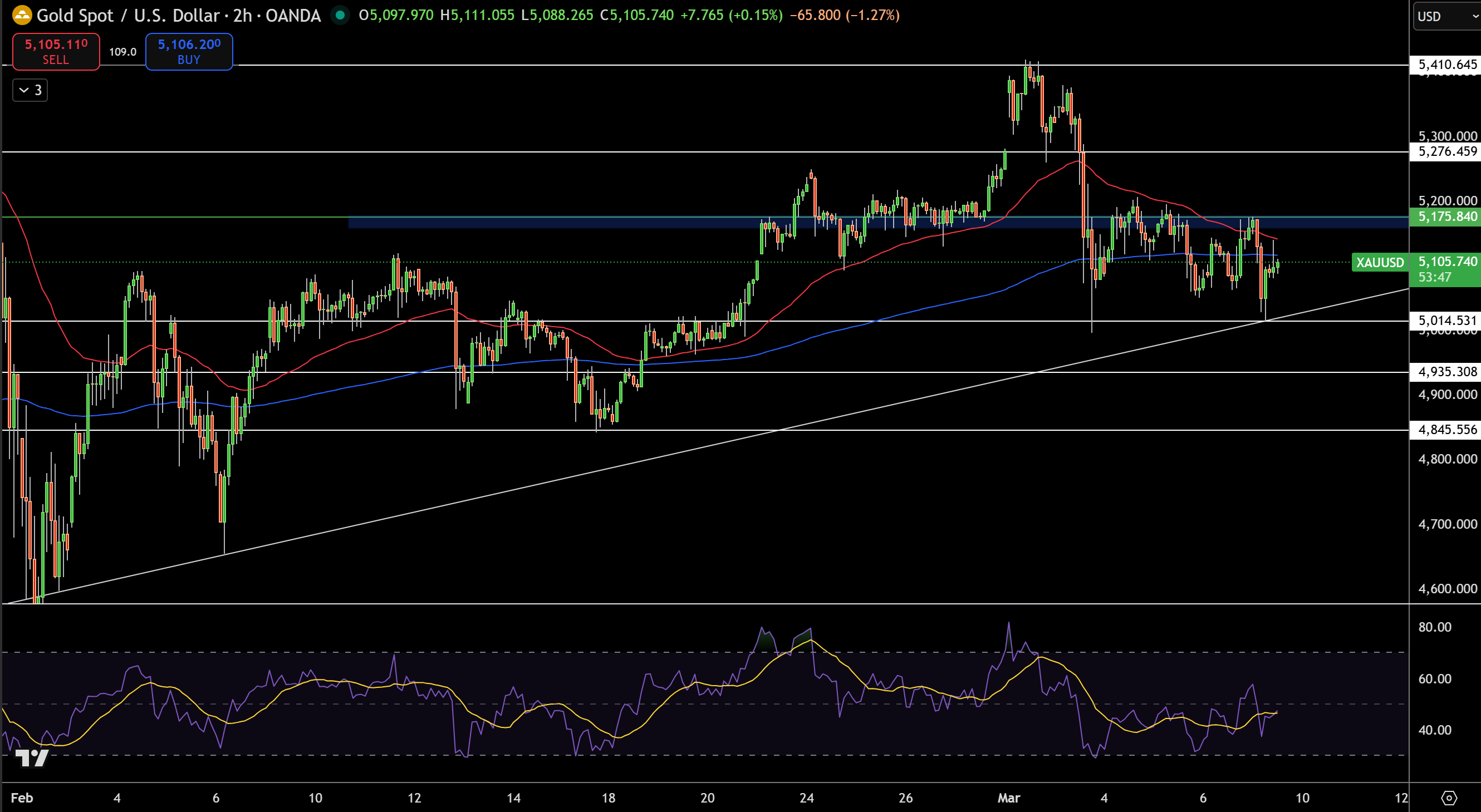 LONDON (March 9) Despite the escalating tensions in the Middle East Gold (XAU/USD) kicked off the new week on the downswing, edging lower around 5,080 and slumping to a low of 5,015 – though big picture the downward trend has as much to do with inflation concerns as it has to do with anything else.