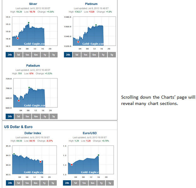 Gold-Eagle now has the most advanced, easy to read, precious metals charts out there. We store our own real-time data. The charts are automatically updated every 5 minutes. The large homepage chart has tabs across the bottom to change the historical view: 24h, 5d, 1m, 6m, 1y, 5y and Max.