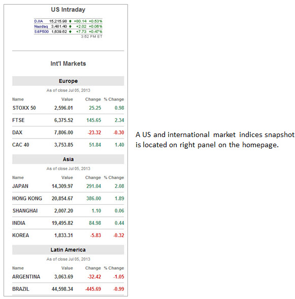 Start your day with a quick scan of the right column of the homepage to view the US and International markets indexes. Our US Intraday module updates throughout the day. The international indices display the last closing prices.