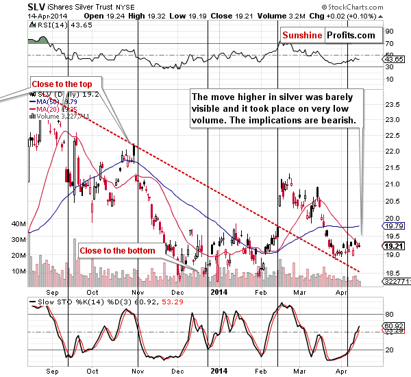 Gold itself moved on Monday, but – once again – the corresponding volume was relatively low and this makes us think that the next downturn is just around the corner. The thing that might appear bullish at this time is that gold managed to rally despite a move higher in the USD Index. It’s not really the case in our view because of 2 reasons: