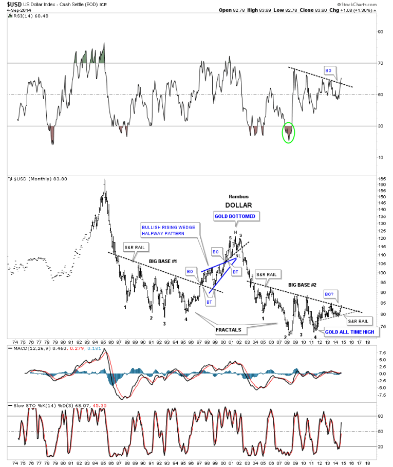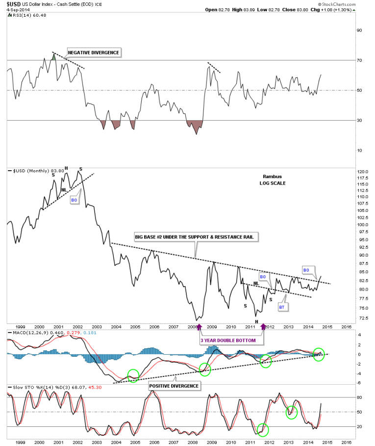 I have shown you many times that a line chart can often times gives you a quicker signal than a bar chart. Below is a monthly line chart that shows Big base #2 with the breakout in progress. Keep in mind this is a monthly line chart so the breakout won’t be complete unless the US Dollar can close the month of September above the big S&R line. It’s a good start to the month.