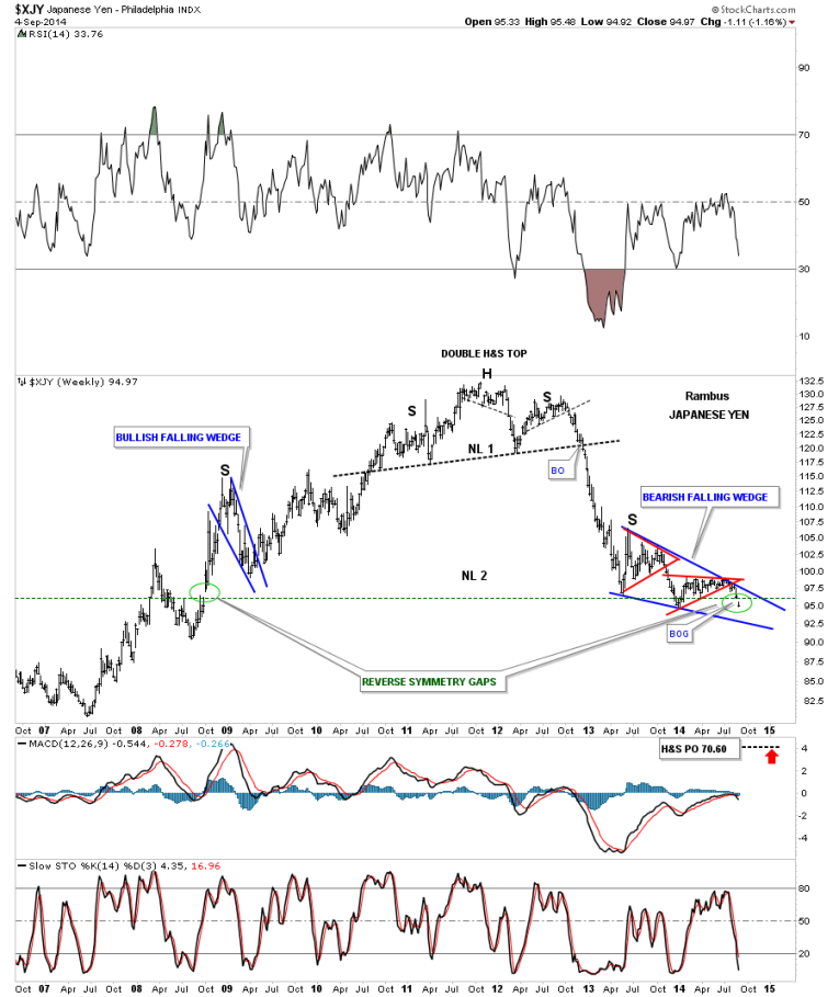 Below is a daily chart for the yen that I showed you a week or two ago and how it broke out of the second blue triangle that is making up the bigger black falling wedge. After the breakout I thought we might get a backtest to the underside of the blue triangle but it’s beginning to look like that might not be the case now. Please note the brown shaded gap area that appeared this week. I think that gap is going to play a big role in the long term move for the yen which I’ll show you in a minute.