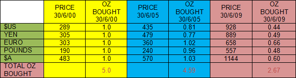 The DJIA on June 30, 2000 stood at 10,447 and at June 30, 2009 the figure was 8,447 - a loss of exactly 2,000 points or 20.7% of the capital value. In other words $289 invested in 2000 would be worth $233. Dividends of 4% per annum or $11.56 would be another $104 for the nine years assuming the dividends were not re-invested on the stock market. The grand total of share market investment plus dividends comes to $337 with which you could buy only 0.36oz of gold on June 30, 2009.