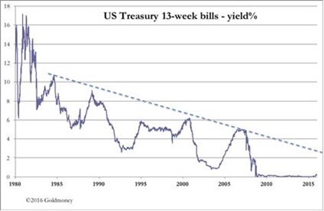 The dynamic that is missing from this simplistic description of an orthodox credit cycle is the level of outstanding debt. The higher it is, the less of a rise in interest rates is required to trigger a downturn in economic activity. So over a long period of increasing accumulations of outstanding debt, the levels of interest rate peaks on successive credit cycles will decline. This is clearly evident in the chart below of the yield on 13-week US Treasury bills.