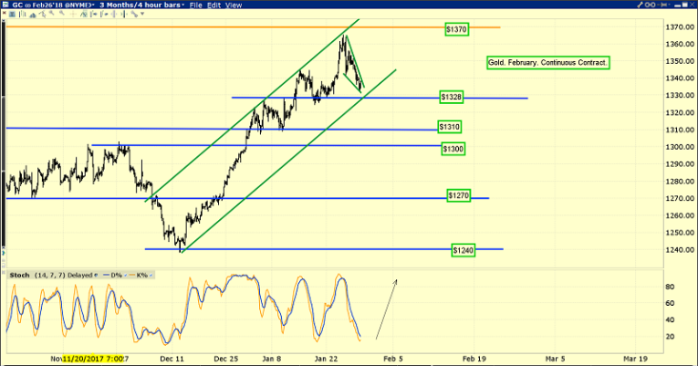 Even though gold has rallied more than $100 an ounce in a very short time frame, the pullback action is very positive. It’s taking the shape of a small positive wedge formation. Solid Chinese New Year demand is likely behind the positive nature of this soft pullback. Global gold investors should be buyers at $1328, $1310, and $1300, with a bigger focus on gold stocks than bullion.