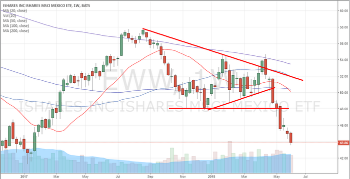 The Mexican iShares (EWW) ETF is about to break multi-year lows.