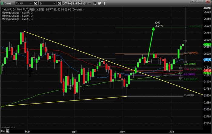 Here is a Daily chart of the YM futures contract showing the recent price breakout and rally. Our expectation is that 26,000 will be breached within 30 days or so and that a large capital shift will drive a continued advance through the end of 2018 – possibly further.