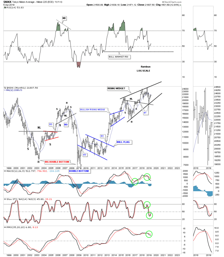 The $NIKK, Nikkei stock market, is one of the most important stock markets in the world so it’s always a good to see what it’s doing. The $NIKK originally topped out in the middle of 2015, but has been trading sideways and is building out a rising wedge formation. Note the backtest to the 2016 H&S bottom neckline which showed me a place to draw in the bottom rail of the rising wedge. Most will view the rising wedge as a bearish rising wedge but I’l reserve judgment until I see which trendline gives way. Note the smaller blue bullish rising wedge which formed just below the bigger one.