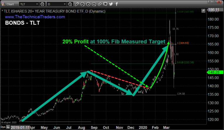 This daily chart of bonds shows the large bullish chart pattern (bull flag). I waited for price to breakout, the trend to turn green, and then entered the trade using Fibonacci extensions for price targets, which I have found are the absolute best way to spot our price targets. If bonds were to rally to the 100% measured move, we would close the trade, and that is what happened exactly.