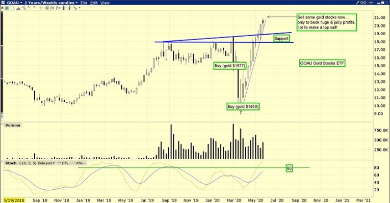 The only reason to sell perhaps 10%-30% of gold stock positions now, is because the profits on miners bought at my gold $1577 and $1450 buy points are fabulous!The time to sell is when the investor feels fantastic.