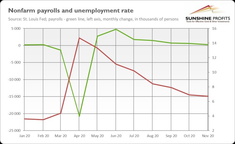 First, let’s examine the facts. As the chart below shows, total nonfarm payrolls in November 2020, rose by just 245,000, following much larger gains of 711,000 in October. What is important here is that the US economy added significantly fewer jobs than expected – economists surveyed by Bloomberg forecasted 466,000 additions. Moreover, the civilian labor force participation rate decreased from 61.7 in October to 61.5 in November.