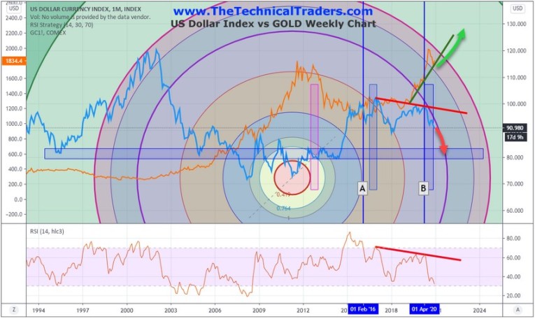 - The US Dollar Index has weakened dramatically since the March 2020 peak and has continued to decline along the heavy dark purple Fibonacci Price Amplitude Arc. As long as this trend continues, we believe the US Dollar Index will decline to historical support levels just above 80 over quite some time (6 to 12+ months). Conversely, Gold has rallied substantially over the past 24+ months and has recently contracted over -15% from recent highs. You will see, near the end of this article, our Custom Metals Index chart that highlights why this recent low price level in Gold is so important.