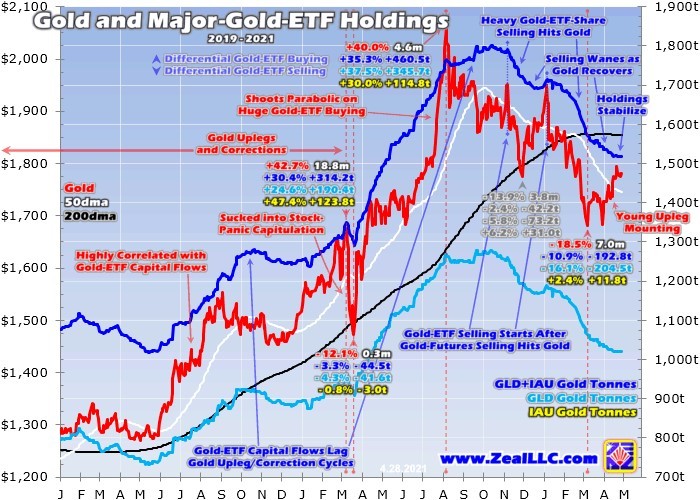 Led by GLD and IAU, investment capital flows into and out of gold ETFs are increasingly dominating gold demand and thus gold-price trends. Since they report their bullion holdings every market day, these gold ETFs also offer the highest-resolution read available on gold investment demand. Changes in gold-ETF holdings, particularly GLD’s and IAU’s, reveal whether investors are shifting money into or out of gold.
