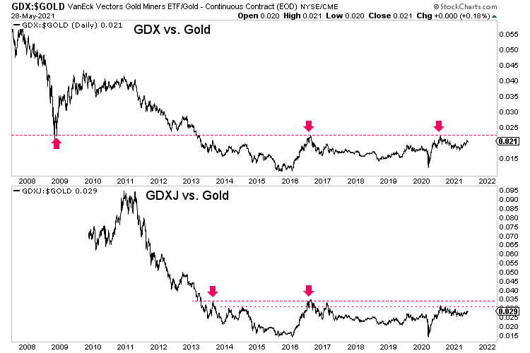 GDX against Gold could be as soon as several months away from a major breakout, and that would be followed by GDXJ breaking out against Gold.