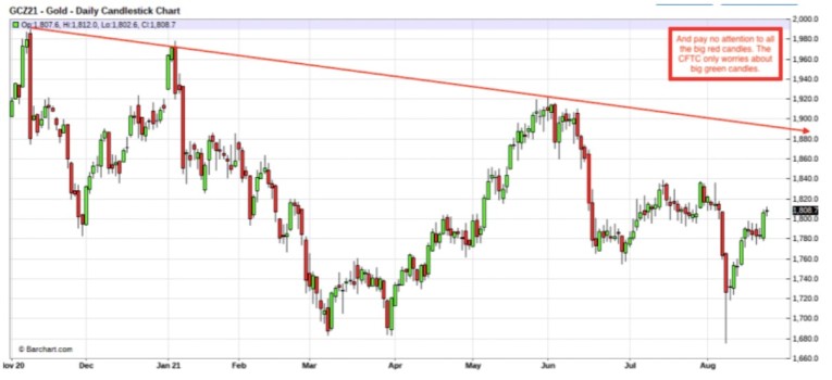Recent price action suggests that Powell is leaning toward taper postponement. After the shock and aftermath of Clarida on August 4, the COMEX gold has regained all its losses from the August jobs report and the price smash that followed on Sunday evening, August 8. Price is not only back above $1800, it has also regained its 50-day moving average. This is certainly encouraging.