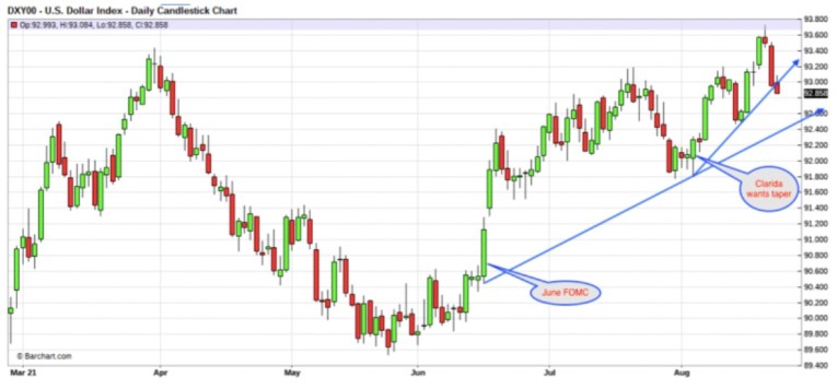 However, this notion was put to rest on August 4, when Fed Vice Chairman Clarida suggested that a taper plan should be formalized in September and put into action in October. This statement by Clarida surged the DXY and crashed the COMEX metals.
