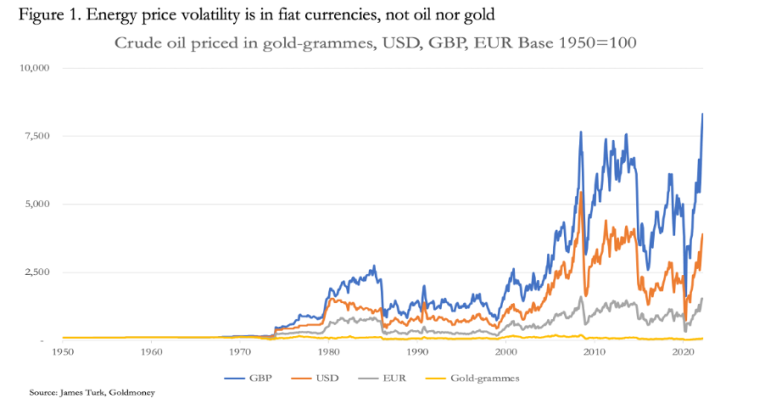 The message from oil’s price history is that volatility is in fiat currencies and not oil. In gold-grammes there has been remarkably little price variation. Therefore, the pricing relationship between a sound currency backed by gold differs substantially from the fiat world we live with today, and there has been very little change in monetarist theory to reflect this fact beyond mere technicalities.