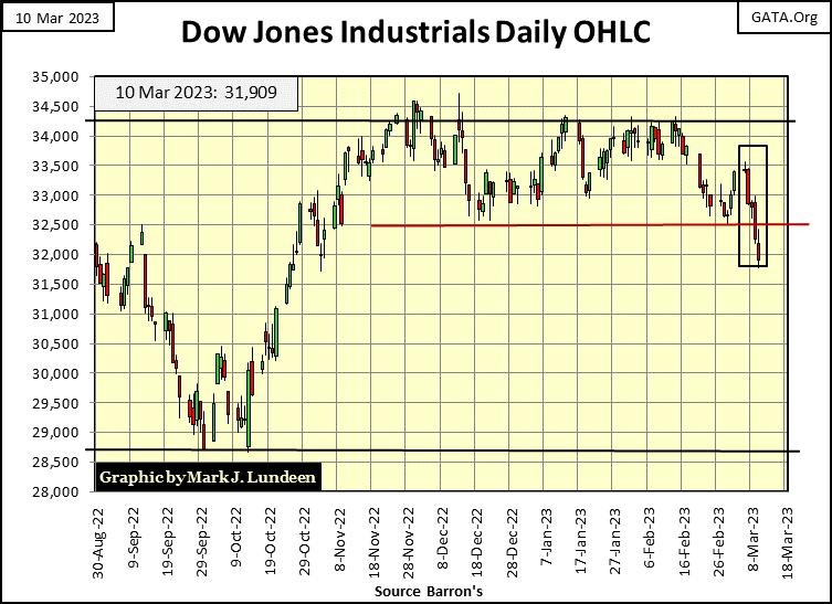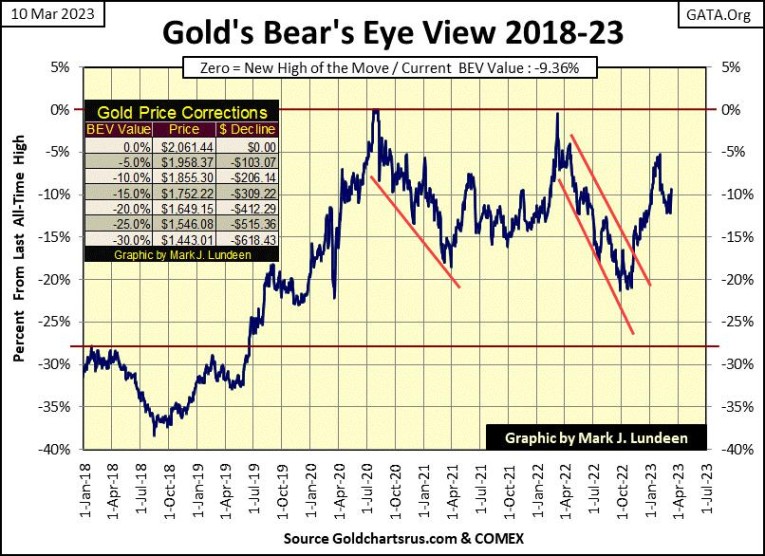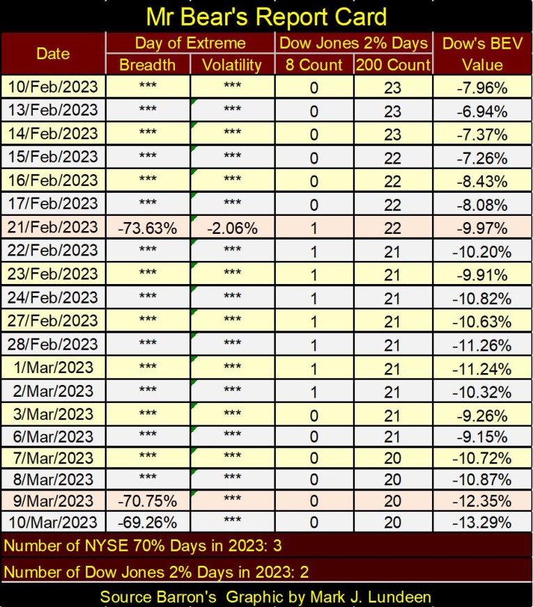 This was a big week for Mr Bear. Several banks in Silicon-Valley had “liquidity problems,” and were closed. Which I take as meaning; for the foreseeable future, in the BEV chart below we’re not going to be looking at the Dow Jones’ BEV -5% line, but its BEV -25% line for clues for what is to come next in the stock market.