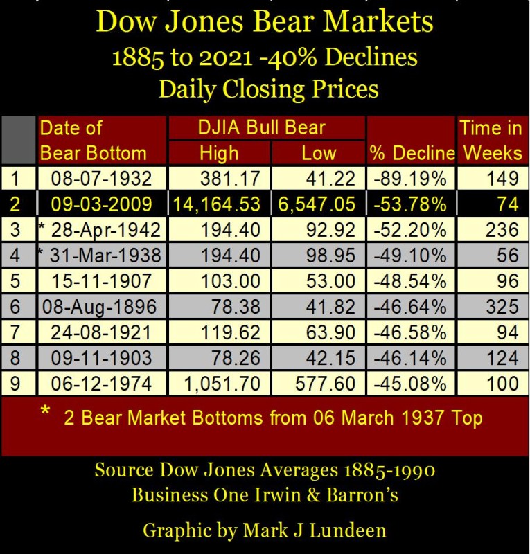 In the table below, I’ve noted nine of the major-bear markets the Dow Jones has seen since 1885 in the BEV chart above, but not every piercing of the BEV -40% line is included. When WWI began, the NYSE was shut down for several months. When it began trading again, the configuration of the Dow Jones was greatly changed – that 40% bear market is not in my list below.