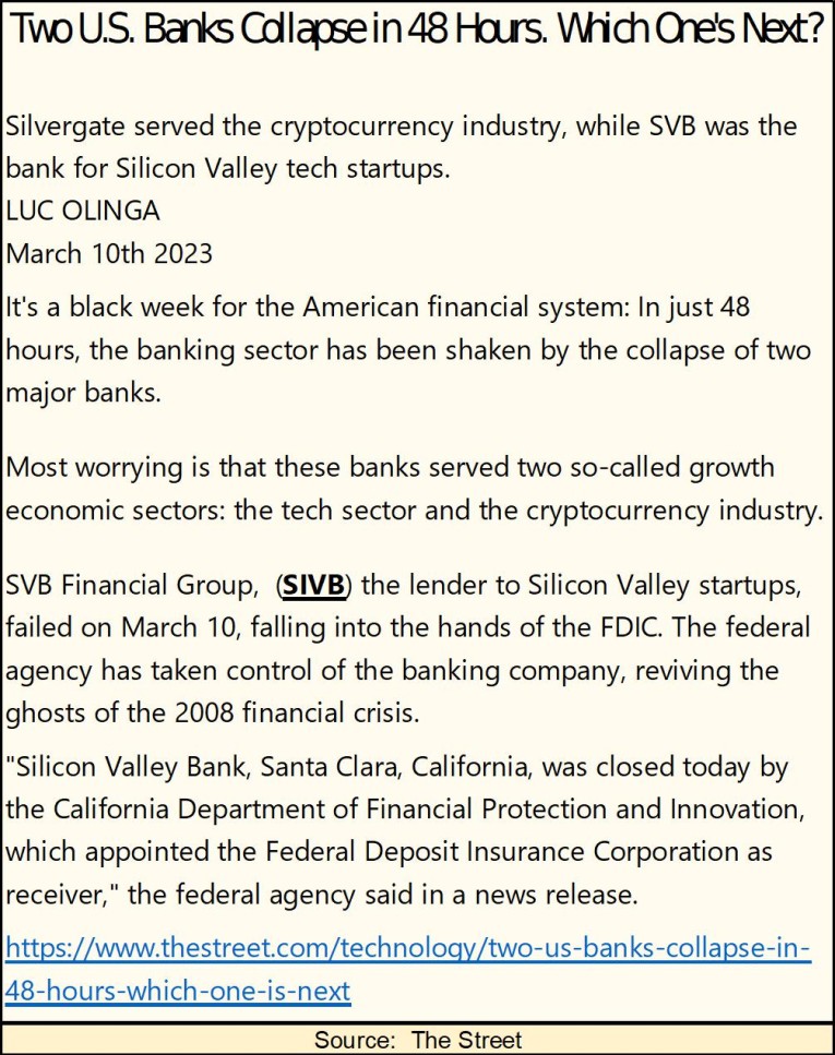 The yield curve for March 2023 is also greatly inverted, which will eventually force the economy into a recession. In recessions, people and businesses draw upon their savings held in the banking system to tide them over the hard times. But a dollar deposited in a bank a few years ago, is now worth less than a dollar to the bank today, dollars the bank must now sell off some of their reserves to come up with to refund a deposit.