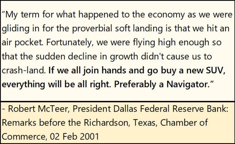 And for the longest time, “market experts”, academics appearing on TV or in the print media, and officials from the Federal Reserve urged people to take on ever more debt as a solution to economic problems caused by too much debt weighing down the economy. The quote below by the then Dallas Fed President, Robert McTeer from 2001 during the 2000-2002 high-tech wreck is one of many told to trusting individuals, foolishly looking for guidance from those in authority.