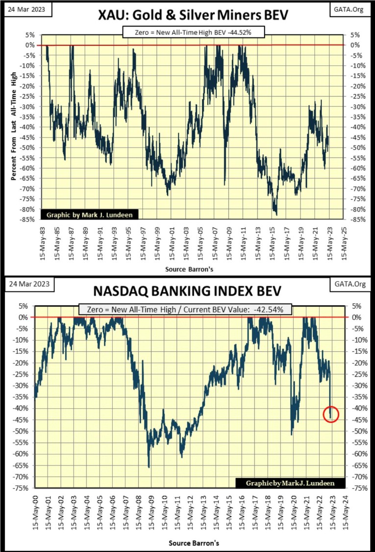 Here is a BEV chart for the XAU and the NASDAQ Banking index, and what is there to learn from them? First, the XAU, unlike the Banking Index, is going the right way – upward from its bear market low of January 2016. It may be like watching paint dry, but the XAU is trending upward off an 83% bear market bottom from seven years ago.