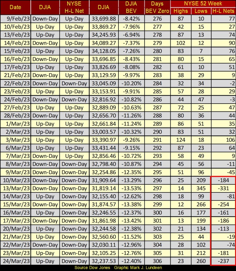 Over at the NYSE, 52Wk Lows continue dominating 52Wk Highs. Nothing extremely bearish, as when 52Wk H-L Nets increase to something over -700. But seeing so few 52Wk Highs at the NYSE since the beginning of the year, it doesn’t justify being a big bull on the stock market. After all, that’s what a bull market on Wall Street is; plenty of 52Wk Highs, week after week at the NYSE. Something I don’t see in the table below.