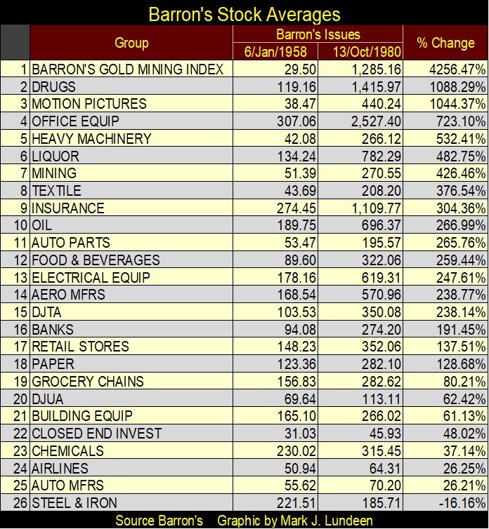 How popular? From January 1958 to October 1980, shares in gold mining were that era’s glamor issues, as seen in the table below. A $1.00 invested in the BGMI in January 1958, became $42.56 in October 1980. From the data available to me, nothing else came close to gold mining during these twenty-two years.