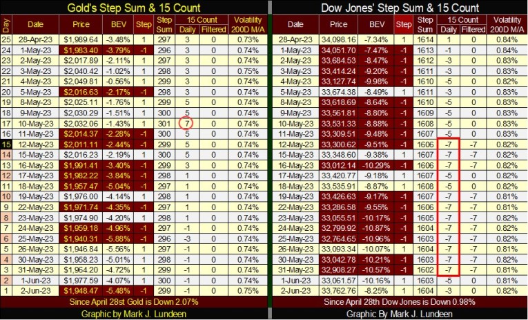 Below, on May 10th, as gold closed at $2036 and in scoring position, it’s 15-count saw a +7, making it an overbought market. Ten trading sessions later, gold closed outside of scoring position, with a BEV of -5.85% and a 15-count of -3. Has gold worked off its May 10th overbought +7 in only ten trading sessions?