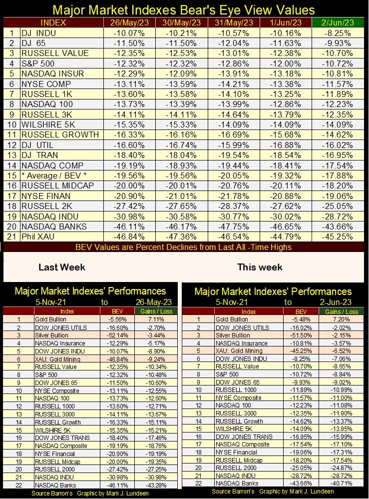 But there are other market indexes’ BEV values listed below too, and more than a few aren’t keeping up with the Dow Jones and S&P500. What a change since the first week of November 2021. In this table then, most of these indexes were at a new all-time high (0.00%), the rest in scoring position; BEVs from -0.01% to -4.99%. The sole exception then was the XAU (#21), who a year and a half ago was down over 45% from its last all-time high of April 2011, where it closed yet again this week.