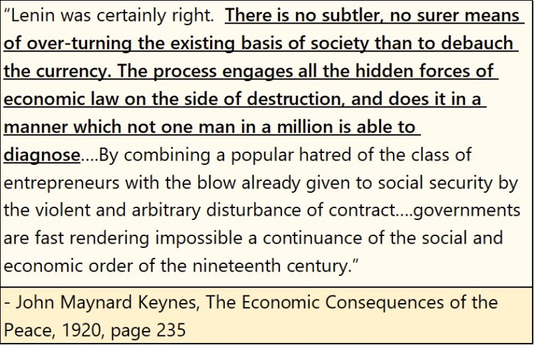 So, what is to come from all this monetary inflation? John Maynard Keynes, the patriarch of Keynesian Economics, which contributed much to the above mess, wrote the following in 1920.
