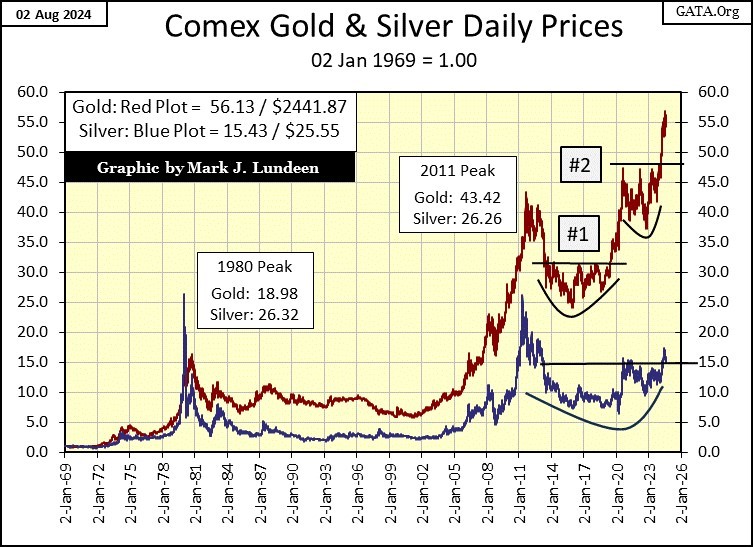 In gold and silver’s indexed plots below, where 1.00 = 02 January 1969, gold closed the week with a factor of 56.13 ($2,441.87). After clearing 55, gold is now advancing, or should be in the weeks and months to come.