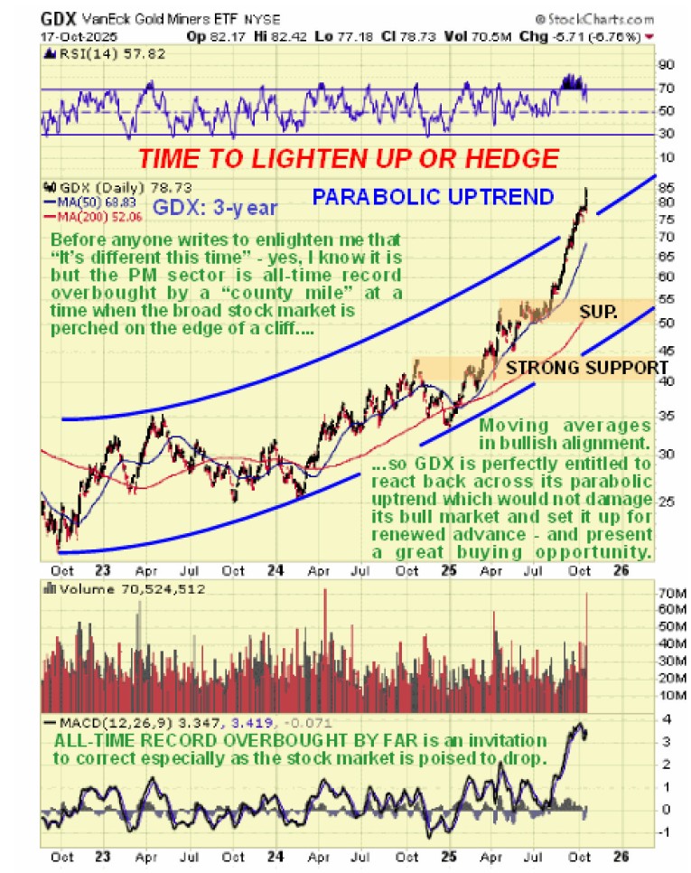So, regardless of the longer-term fundamentals for gold and silver which we know are spectacular, we can expect them to take a hit from temporary dollar strength and correct back and as we can see on the 3-year chart for GDX, PM stocks are certainly vulnerable to a significant correction as they have risen steeply in recent weeks to become all-time record overbought near to the top of their accelerating parabolic uptrend channel. This is an excellent point for them to reverse to the downside into a sizable intermediate correction and if the stock market drops hard or even crashes then we can expect GDX to drop at least to the first support level shown in the $50 - $55 zone which would result in losing all or most of our gains of recent months. If this happens and the dust then settles on the stock market it will be an outstanding point for those who step aside to dodge the correction to buy back and to add to positions.