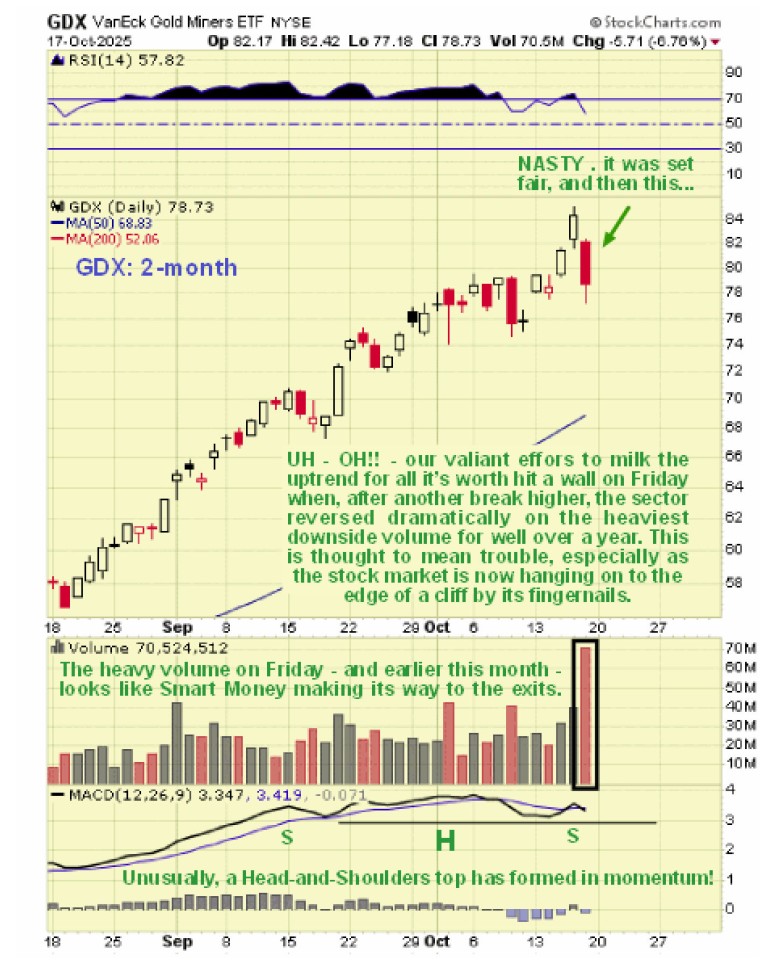 On the 7-month chart we can see the steep and thus far orderly uptrend in force from the start of August and the warning signs that it is probably about to fail, namely the reversal on very heavy volume on Friday which looks like Smart Money bolting for the exits and this is especially so as there were a couple of high volume down days earlier this month. In addition we can see that upside momentum is starting to fail with, unusually, a Head-and-Shoulders top appearing to form in the MACD indicator and if this breaks down then GDX is likely to plunge and as it is currently way above its 200-day moving average it could correct back down towards this indicator. A reason that the drop could be fierce is that most everyone is bullish on the sector and “is on one side of the boat” so the switch from greed to fear could be something to behold.